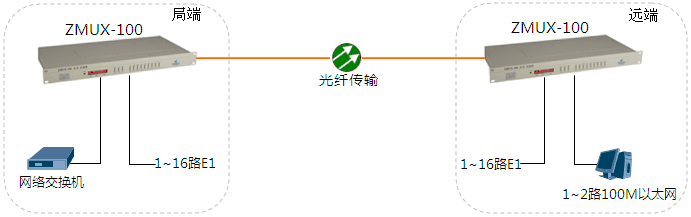 局端站與遠(yuǎn)端站間通過光纖點對點通訊。局端站1~16路E1接口(2M接口)及1~2路共享速率100M以太網(wǎng)接入到ZMUX-100后轉(zhuǎn)換成光信號,再連接上光纖傳輸?shù)綄Χ苏具€原出來。