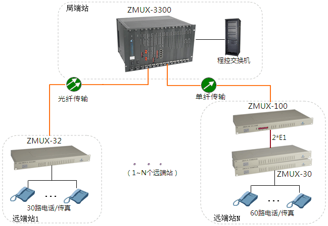 遠(yuǎn)端N的ZMUX-30接入60路電話(可選配其它業(yè)務(wù))復(fù)用成2路E1信號,通過E1接口(2M接口)級聯(lián)ZMUX-100,再轉(zhuǎn)換成光信號,通過光纖傳輸?shù)綄Χ巳ァ?/p>
