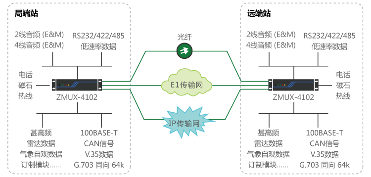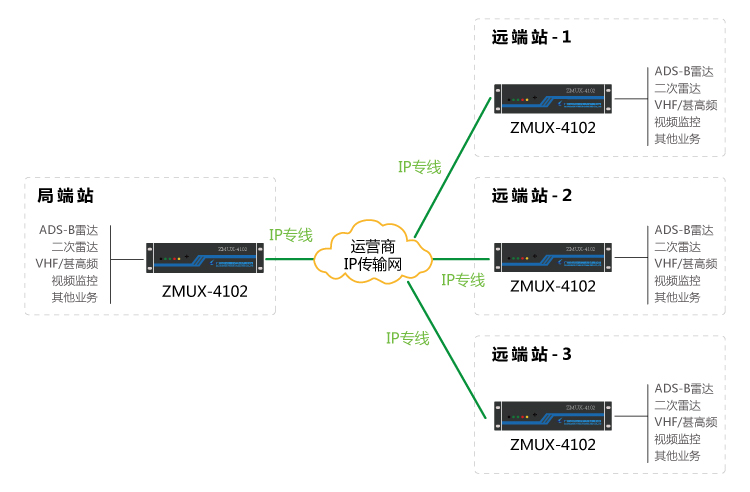 基于IP專線、光纖線路、E1 線路自動(dòng)切換:遠(yuǎn)端站到局端之間,租用運(yùn)營(yíng)商IP專線與E1線路、光纖線路,通過(guò)接入ZMUX-4102平臺(tái),完成IP專線與E1線、光纖線路自動(dòng)切換功能,保障甚高頻、雷達(dá)數(shù)據(jù)等業(yè)務(wù)的安全可靠性傳輸。